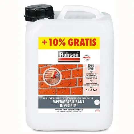 L’impermĂ©abilisant mur Rubson Invisible 5L + 500ml gratuits offre une protection incolore aux façades contre les infiltrations d’eau, l’humiditĂ©, les salissures, les dĂ©pĂ´ts verdâtres et les dĂ©gâts dus au gel. Il est adaptĂ© pour tous les matĂ©riaux poreux non peint comme la brique, le grès, le ciment, le bĂ©ton, le plâtre, la tuile. En plus des façades, il peut Ă©galement ĂŞtre appliquer sur des monuments, statues ou des toitures. Cet impermĂ©abilisant créé un effet perlant qui engendre un rejet de l’eau. Il est non filmogène ce qui signifie qu’il laisse respirer les murs. Une fois traitĂ©, un support ne peut plus ĂŞtre peint pendant 7 ans.