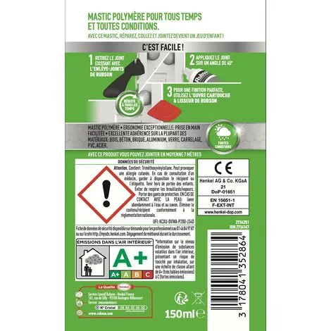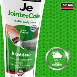 Le mastic Rubson Je Jointe & Colle est un mastic polymère adaptĂ© pour une application extĂ©rieure. Il permet d’effectuer des rĂ©paration, des rebouchages ou des fixations durables et qui rĂ©sistent aux intempĂ©ries. Utilisable sur des supports secs ou humides.CaractĂ©ristiquesExcellente adhĂ©rence sur la plupart des matĂ©riaux : bois, bĂ©ton, brique, aluminium, verre, carrelage, PVC, acier.RĂ©siste aux intempĂ©riesCouleur : TransparentSous-marque : Rubson Mastic et Mousse Expansive