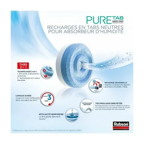 - Emballage – Rubson AÉRO 360° Pure 4 Recharges tabs Neutres, Recharges anti-odeurs & anti-humiditĂ© pour absorbeur Rubson, Recharges anti-moisissures & anti-acariens, Lot de 4 recharges