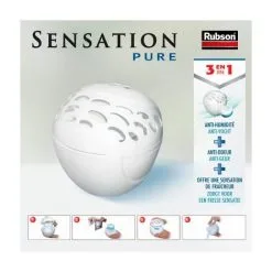 - Emballage – Rubson Absorbeur d’HumiditĂ© Sensation Pure, DĂ©shumidificateur d’air anti-acariens, anti-moisissures, Purificateur d’air anti-odeurs aux cristaux actifs, 1 appareil + 1 recharge neutre de 300 g.