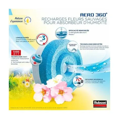DotĂ©es d’une technologie innovante 3 en 1, les recharges AERO 360° Nature Experience permettent non seulement de rĂ©duire l’excès d’humiditĂ©, mais aussi de neutraliser les odeurs et de crĂ©er une ambiance relaxante Ă la maison grâce Ă leur parfum naturel, gourmand et floral de vanille, musc et jasmin. Leurs cristaux actifs ultra absorbants et des agents anti-odeurs aident Ă prĂ©venir les problèmes d’humiditĂ© courants comme la condensation, les moisissures et les mauvaises odeurs dans la maison. Leur dĂ©licat parfum de fleurs sauvages obtenu par des huiles essentielles vous offrira une expĂ©rience sensorielle unique et vous procurera une sensation de calme et de sĂ©rĂ©nitĂ©. Les tablettes ultra-absorbantes sont parfaites pour recharger votre absorbeur d’humiditĂ© AERO 360° afin d’assurer un contrĂ´le durable et efficace de l’humiditĂ© ! Ces recharges sont compatibles avec la plupart des absorbeurs d’humiditĂ© de 450 g ou plus.