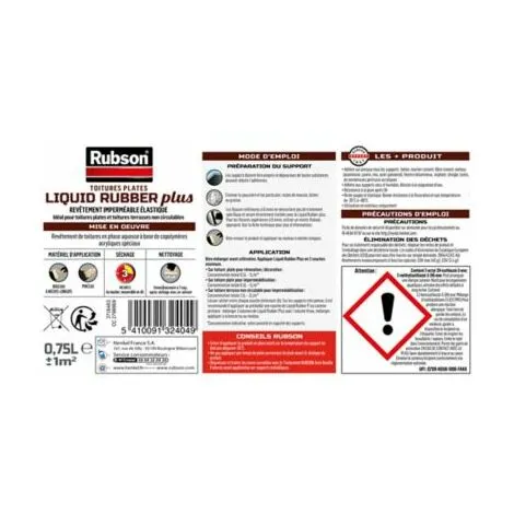 Rubson Liquid Rubber Plus est un rĂŞvetement d’Ă©tanchĂ©itĂ© pour l’impermĂ©abilisation et la renovation de toutes toitures. Il sÂ’applique sur les toitures en zinc, tĂ´les galvanisĂ©es, fibre-ciment, surfaces non-circulables. Il sÂ’applique Ă©galement sur des gouttières, Ă©coulements, bacs, rĂ©servoirs, murs enterrĂ©s et terrasses non circulables. Et convient pour l’Ă©tanchĂ©itĂ© de regards dÂ’Ă©vacuations pluvialeset la protection de dessous de carrosseries. Il adhère sur tous matĂ©riaux, mĂŞmes humides et rĂ©siste aux variations de tempĂ©ratures (-20°C Ă +80°C). Sa formule est sans solvant, facile Ă appliquer et offre une protection longue durĂ©e.