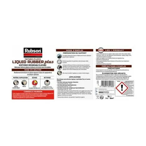 Rubson Liquid Rubber Plus est un rĂŞvetement d’Ă©tanchĂ©itĂ© pour l’impermĂ©abilisation et la renovation de toutes toitures. Il sÂ’applique sur les toitures en zinc, tĂ´les galvanisĂ©es, fibre-ciment, surfaces non-circulables. Il sÂ’applique Ă©galement sur des gouttières, Ă©coulements, bacs, rĂ©servoirs, murs enterrĂ©s et terrasses non circulables. Et convient pour l’Ă©tanchĂ©itĂ© de regards dÂ’Ă©vacuations pluvialeset la protection de dessous de carrosseries. Il adhère sur tous matĂ©riaux, mĂŞmes humides et rĂ©siste aux variations de tempĂ©ratures (-20°C Ă +80°C). Sa formule est sans solvant, facile Ă appliquer et offre une protection longue durĂ©e.