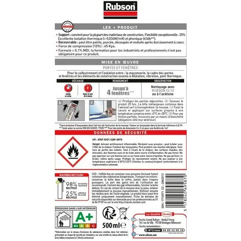 RUBSON ISOLE est une mousse expansive polyurĂ©thane mono composante qui durcit au contact de l’humiditĂ© de l’air et des matĂ©riaux. Cette mousse est spĂ©cialement formulĂ©e pour s’intĂ©grer aux systèmes d’isolation selon les dispositions de la RT 2012.Isolation thermique et phoniqueRupture du pont thermique entre ouvrages et maçonneriesIsolation des combles et canalisations.Adhère Ă la plupart des matĂ©riauxFlexibilitĂ© : 25%Ne dĂ©forme pas le supportTemps de sĂ©chage: 2 hTempĂ©rature d’utilisation mini: 5°CTempĂ©rature d’utilisation maxi: 30°CRendement : Environ 20 litres de mousse durcieContenance : 0,5LSous-marque : Rubson Mastic et Mousse Expansive
