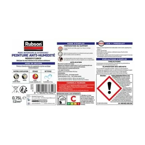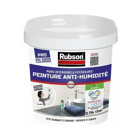 - Emballage – Rubson Peinture Anti-HumiditĂ©, pot peinture blanche antifongique : Ă©vite salpĂŞtre, cloquage ou efflorescence, 1 seau de 0,75 L. Consommation : 0.6 Ă 1.2 L / m²*.
